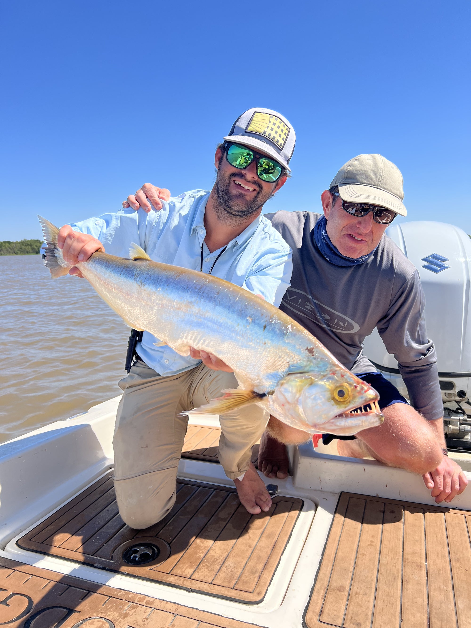 Close-up of a large Payara fish held by a person, with Blackbone outfitters